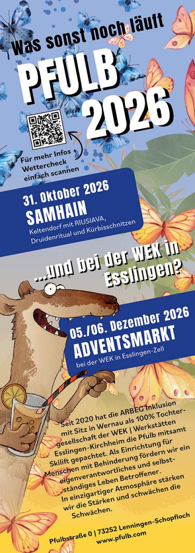 Wir, die ARBEG Inklusion mit Sitz in Wernau und 100%-ige Tochter der WEK | Werkstätten Esslingen-Kirchheim gGmbH, sehen uns viel mehr als Pächter bzw. Betreiber der Pfulb. Wir wollen hier Betrieb machen! Und zwar richtig. Wir möchten für Menschen mit und ohne Handicap Raum bieten, ihre Freizeit zu genießen und gestalten zu können. Die Pfulb ist dabei nicht unser erstes „Baby“. In vielen Arbeitsgruppen und in eigenen Firmen wie beispielsweise dem Cafe Morlock in Plochingen oder der Maultaschen Haltestelle in Wernau leben wir mit unseren Mitarbeiterinnen und Mitarbeiter Inklusion. Menschen mit Handicap geben wir eine Chance, sich auf dem Arbeitsmarkt zu beweisen. Selbstverständlich unter fachkundiger Anleitung. So entsteht eine einzigartige Atmosphäre. Wir stärken die Stärken und schwächen die Schwächen.